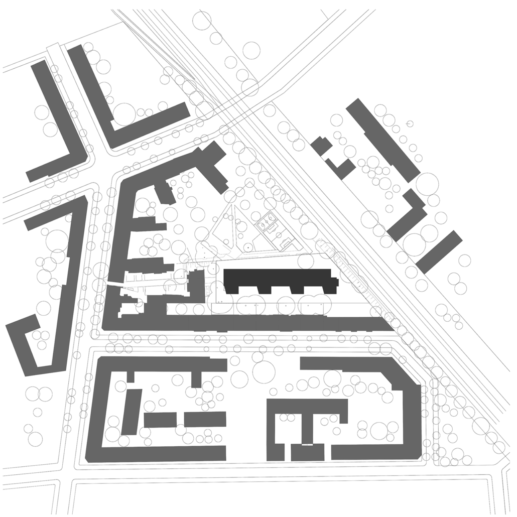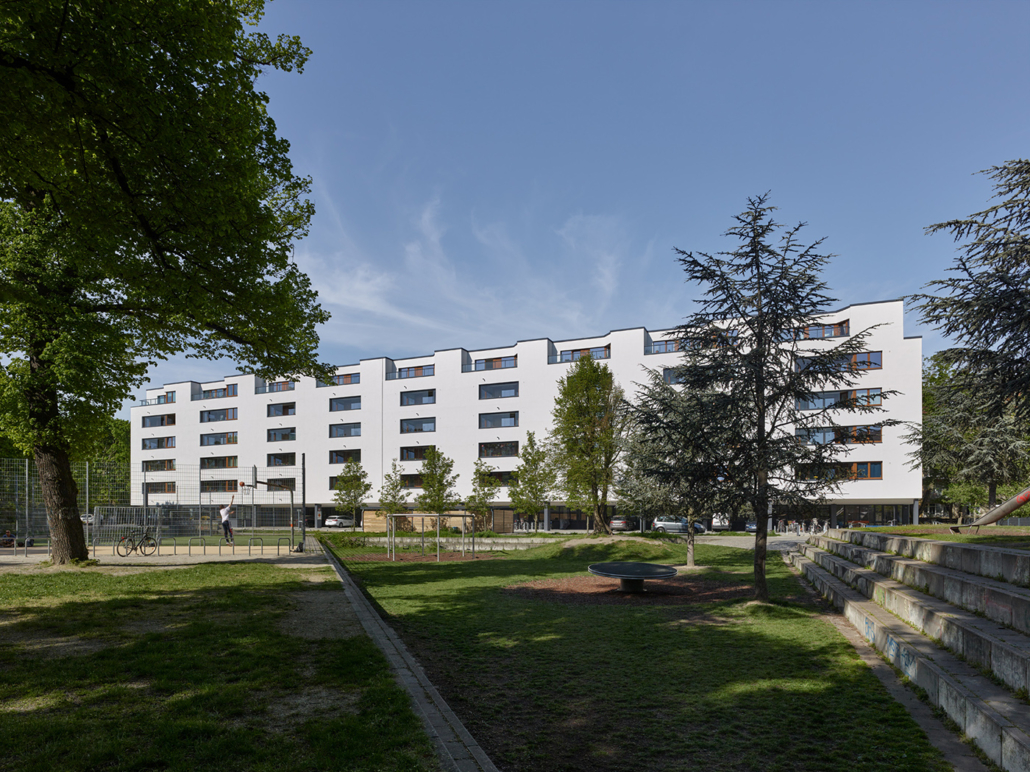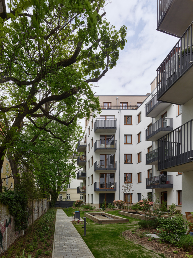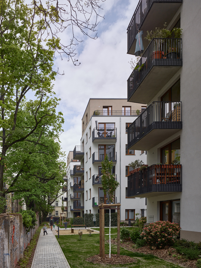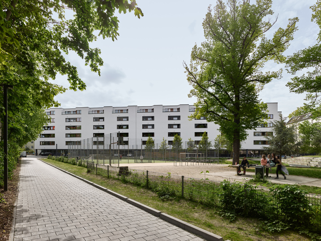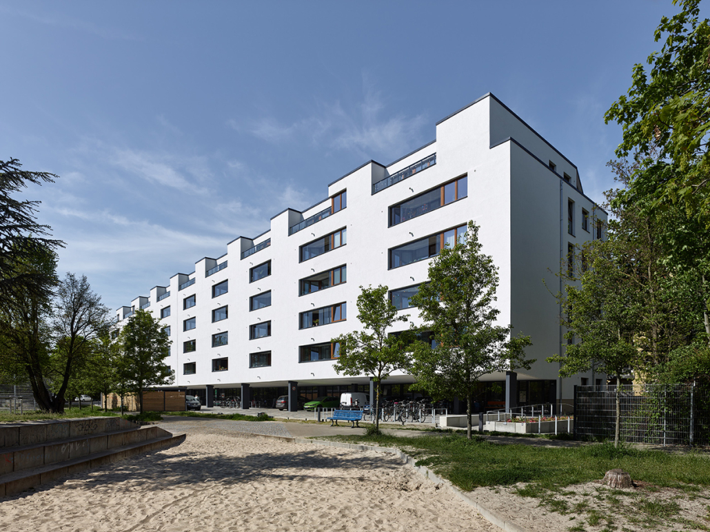 Die Genehmigung über §34 BauGB, also über das „Einfügen in die Umgebung“, war ein intensiver Abstimmungsprozess mit den Behörden und den Nachbarn. Im Zuge der Planung wurde die Großform an der Westseite durch Anbauten ergänzt, die Bezug auf die kleinteiligere gründerzeitliche Altbaustruktur nehmen. Zum Westen waren wegen des Bolzplatzes umfangreiche Schallschutzmaßnahmen an Fenstern und Loggien erforderlich.