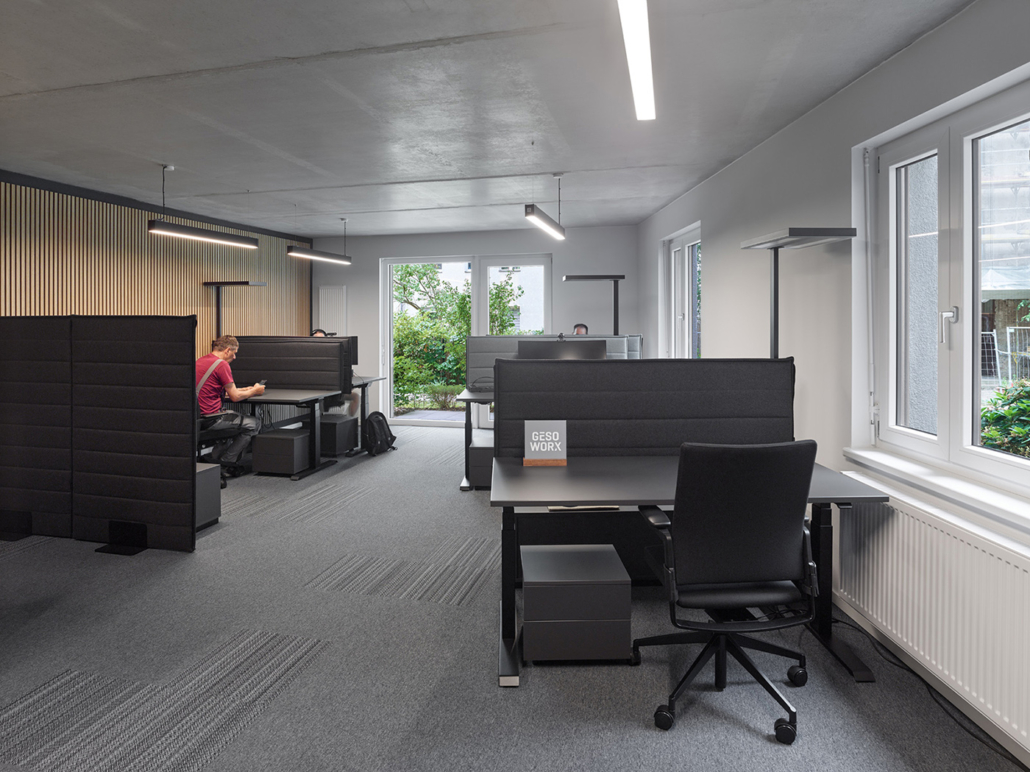 Unter dem Schlagwort „Stundenplanhaus“ sollten verschiedene im Haus verteilte Gemeinschaftsräume zur Wohnung oder durch die Nachbarschaft zur Miete genutzt werden. Ein 100 qm großer Gemeinschaftsraum im Erdgeschoss bildet das Herzstück einer Community Area. Diese großzügige Kommunikationsfläche soll allen Bewohner*innen für gemeinschaftliche Aktivitäten dienen. Zusätzlich befinden sich vier mietbare Arbeitsplätze im Erdgeschoss. Dieser Coworking-Bereich (GESOWORX Coworking) kann bei Bedarf flexibel gebucht werden und als separater Arbeitsplatz außerhalb der Wohnung genutzt werden. Verschiedene Sharing-Angebote für Auto oder E-Bikes stehen den Bewohner*innen zur Verfügung.