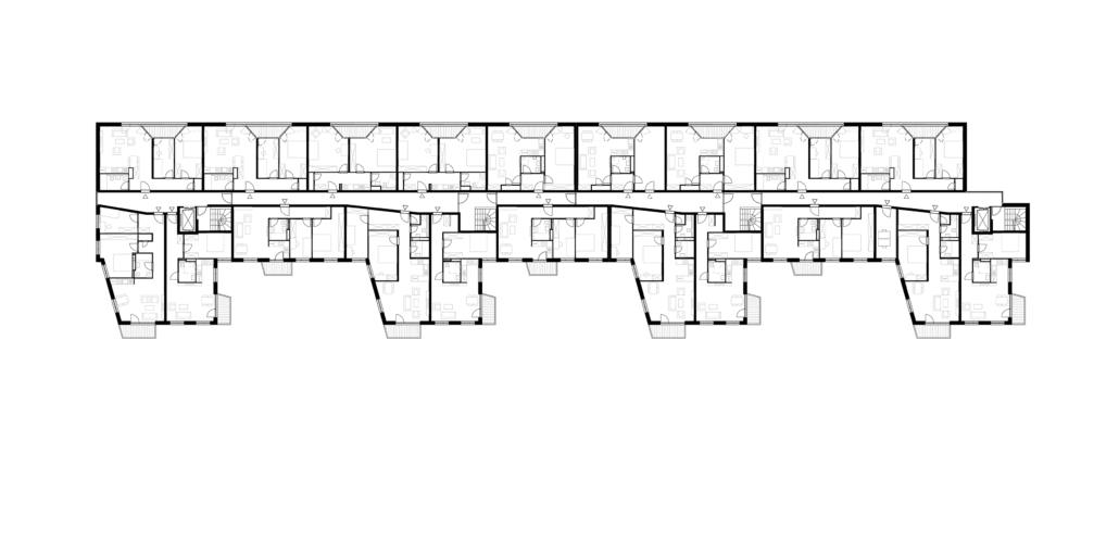 Die 107 Wohneinheiten sind über 7 Etagen an einer Mittelflurerschließung nach Osten und Westen orientiert. Mit Wohnungsgrößen von ca. 47m² bis 102 m² bilden sie die Vorgaben des Wohnungsschlüssels unserer Auftraggeberin ab.