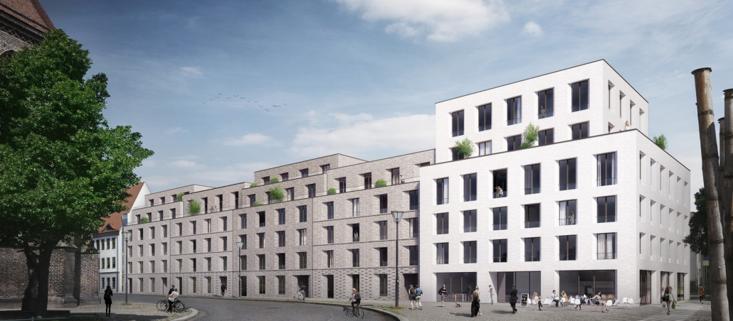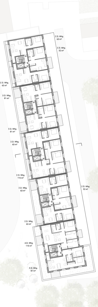 Die besondere Qualität des „Durchwohnens“ ist bei der Konzeption der Grundrisse ausschlaggebend. In allen Gebäuden bietet die Mehrheit der Wohnungen eine zweiseitige Orientierung. Die Erschließungskerne und Installationsschächte sind so angeordnet, dass eine Grundrissflexibilität für 2-, 3- und 4 Zimmerwohnungen entstanden ist und eine nachträgliche Trennung der Einheiten möglich ist. Die Wohnungen lassen sich über definierte Schnittstellen der Innenräume zusammenschalten. Mit folgendem Wohnungsschlüssel bietet unsere Planung 61 Wohneinheiten: 40 WE 2-Raumwohnung / 12 WE 3-Raumwohnung / 9 WE 4-Raumwohnung Die Gebäude sind als 2- bis 3-Spänner organisiert, so dass die Mehrheit der Wohnungen zweiseitig (durchgesteckt) ausgerichtet ist. Nur das Eckgebäude ist als 4-Spänner angelegt, wovon der Großteil der Wohnungen zweiseitig ausgerichtet sind (durchgesteckt oder über Eck). Die durchgesteckten Wohnungen mit einer zweiseitigen Ausrichtung der Aufenthaltsräume ermöglichen einen Bezug zur Kirche und zum Innenhof. Es ist eine optimale Querlüftung möglich. Auf der Westseite zur Kirche sind Loggien und auf der Ostseite zum Hof Balkone vorgesehen. Die Wohnungen in den obersten Geschossen erhalten private Dachterrassen.