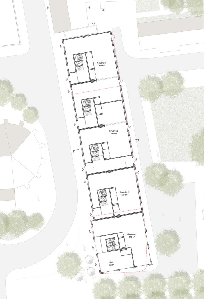 Die Erdgeschosszone wird durch große Zugänge gegliedert, ein Durchgang schafft die Verbindung mit dem Innenhof. Um große Gewerbeflächen zu schaffen, wird das Grundstück im Erdgeschoss bis zur östlichen Grundstücksgrenze bebaut. Die Wohnungen im 1. OG haben Privatgärten auf dem Dach der Gewerbe.