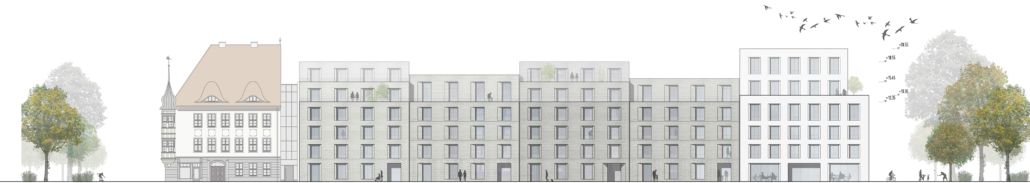 Gegliederte Baukörper auf der westlichen Baulinie bilden einen klar formulierten Straßenraum. Entlang der Großen Oderstraße schlagen wir eine Aufteilung in 5 Häuser mit je 4 Geschossen plus ein bis zwei Staffelgeschossen vor. Die vier nördlichen Gebäude sind gleich im Umriss und Höhe. Im Dachgeschoss variieren die Tiefe der Terrassen und die Geschosshöhen. Die höher gesetzte Traufe des vorspringenden Eckbaus fasst räumlich die Große Oderstraße und stellt den Anschluss an die Innenstadt her.