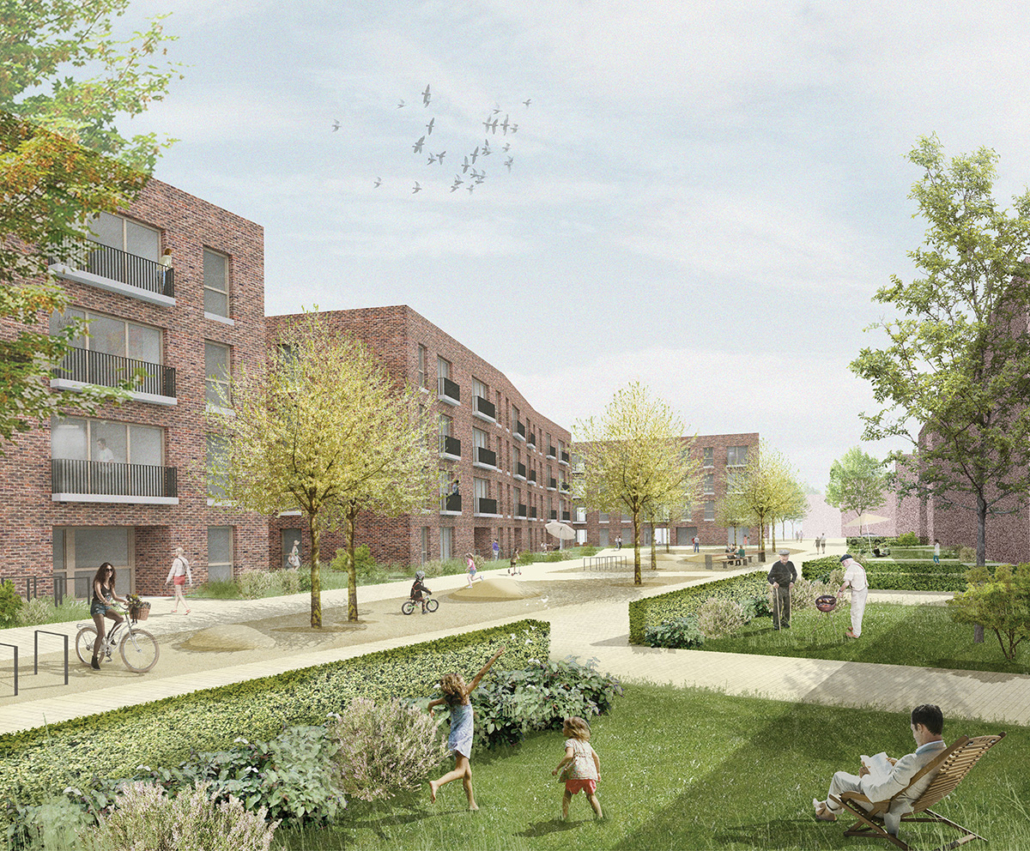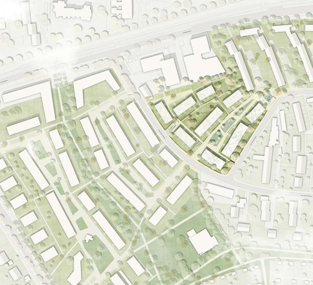 Der städtebauliche Fußabdruck des Konzepts ‚Buchholzer Grün‘ mit einer offenen Angerbebauung wird östlich der Straße ‚In den Sieben Stücken‘ beibehalten. Gegenüber dem architektonischen Entwurf von drei Gebäuden des Clusters A erstreckt sich die Freiraumplanung auf das Gesamtgebiet mit den Clustern A, B und C. Konzeptionell kommt dem südlichen Anger eine wichtige fußläufige Verbindung zwischen der Neuplanung des ehemaligen Standortes des Oststadtkrankenhauses und dem vorhandenen Quartier mit einer Zeilenbebauung in Nord-Süd-Richtung längs der Podbielskistraße zu. Der sich nach Osten verjüngende Anger mit großzügigen Wegen und Inseln für Spiel und Aufenthalt endet auf einem baumbestandenen Platz, der in den westlichen Hof der bestehenden Zeilenbebauung überleitet. Im Verhältnis dazu ist der mittlere Anger mit einem Erschließungsweg und einem höheren Grünanteil belegt, während der kleine nördliche durch einige der dezentral verteilten Stellplätze bestimmt wird. Entsprechend den unterschiedlichen Architektursprachen in den Clustern, ändert sich die Nutzung und einhergehend die Gestalt der drei Anger.