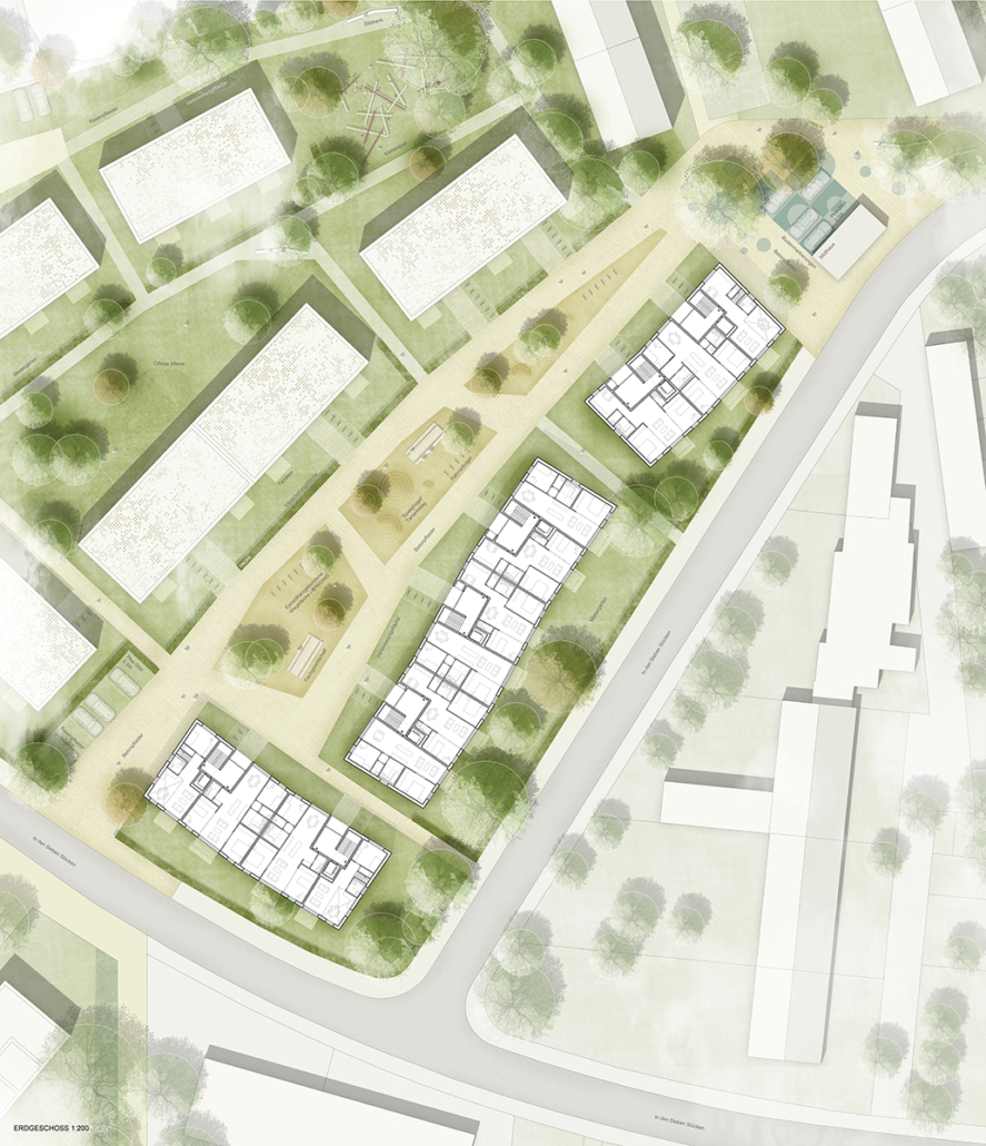 Die Erschließung der Gebäude geschieht von Südosten, so dass die Erdgeschosswohnungen hier von Hecken gesäumte Mietergärten aufweisen. Ein Teil der Freianlagen befindet sich über einer Tiefgarage, deren Lage und Größe noch zu definieren ist. Eine Tiefgaragenzufahrt wird von dem westlichen Abschnitt der Straße ‚In den Sieben Stücken‘ geplant. Sämtliche Funktionsbereiche im Außenraum wie Spieflächen, Pkw-, Fahrradstellplätze und Müllstandorte sind dezentral in Wohnungsnähe und günstig für die entsprechenden Dienstleister (Müllabfuhr) gelegen.