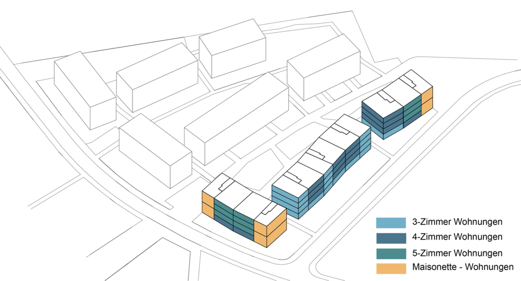 Das Grundstück „In den Sieben Stücken“ liegt in Groß-Buchholz, Hannover in unmittelbarer Nachbarschaft zu Gewerbe- und Bürogebäuden im Norden, Reihenhaussiedlungen und Geschosswohnungsbau im Osten und Süden sowie dem zukünftigen Wohnquartier „Buchholzer Grün“ im Westen. Die städtebauliche Konfiguration der Volumen auf den Clustern A, B und C ist durch leichte Verdrehungen zu einander geprägt. Daraus resultiert ein Wechselspiel aus räumlichen Aufweitungen und Verengungen. Dieses Stilmittel wird als Thema der neuen Bebauung auf Cluster A übernommen. Die Baukörper werden durch leichte „Knicke“ gegliedert und erhalten somit proportionale Bezüge unter einander und zu ihrer Umgebung.