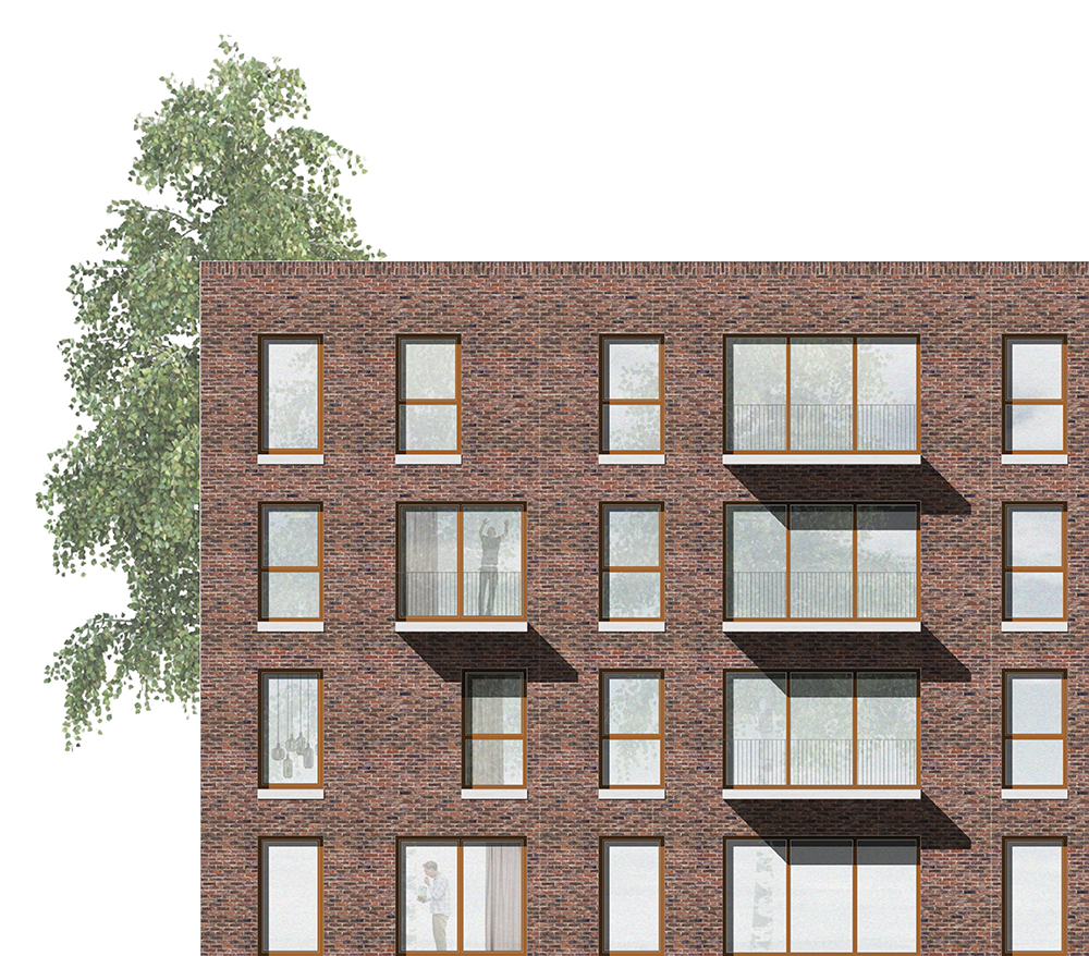 Die Ziegel-Fassade ist als hochgedämmte, zweischalig hinterlüftete Konstruktion geplant. Der vorgeschlagene Ziegel von Wienerberger (Fabrikat Roßlau) bedeckt die gesamte Fassade in einem Wilden Verband. Der Attika-Abschluss wir mit einer Rollschicht ausgebildet. Fensterbänke und Balkone werden als Betonfertigteile ausgebildet. Die Balkone sind thermisch getrennt. Die Fassadenöffnungen sind bodentief. Die Maisonette-Wohnungen erhalten an der Giebelseite im Bereich des Luftraumes eine großformatige vertikale Öffnung um die Besonderheit der Nutzung auch in das Fassadenbild zu übertragen.