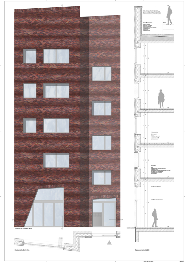 Die Ziegel-Fassaden sind als zweischalige Konstruktion mit einem Schalenabstand von 25 cm und einer 24 cm starken Kerndämmung geplant. Der vorgeschlagene Ziegel von Wienerberger im Normalformat 240/115/71 Fabrikat Roßlau mit einer Diffusionswiderstandszahl von 50/100 bedeckt die gesamte Fassade in einem wilden Verband. Die Öffnungen im Erdgeschoss erhalten als oberen Abschluss eine Rollschicht. Die Fenster in den Geschossen darüber werden mit einem Fertigteilsturz und Winkelkonsolen ausgeführt. Zur Vermeidung von Rissen werden der Fertigteilsturz und das Brüstungsmauerwerk durch Anordnung vertikaler Dehnungsfugen getrennt. Die Attika wird wie die Öffnungen im Erdgeschoss mit einer stehenden Rollschicht als Fertigteil ausgeführt. Alle Fenster sind mit einer 3-fach Verglasung geplant.