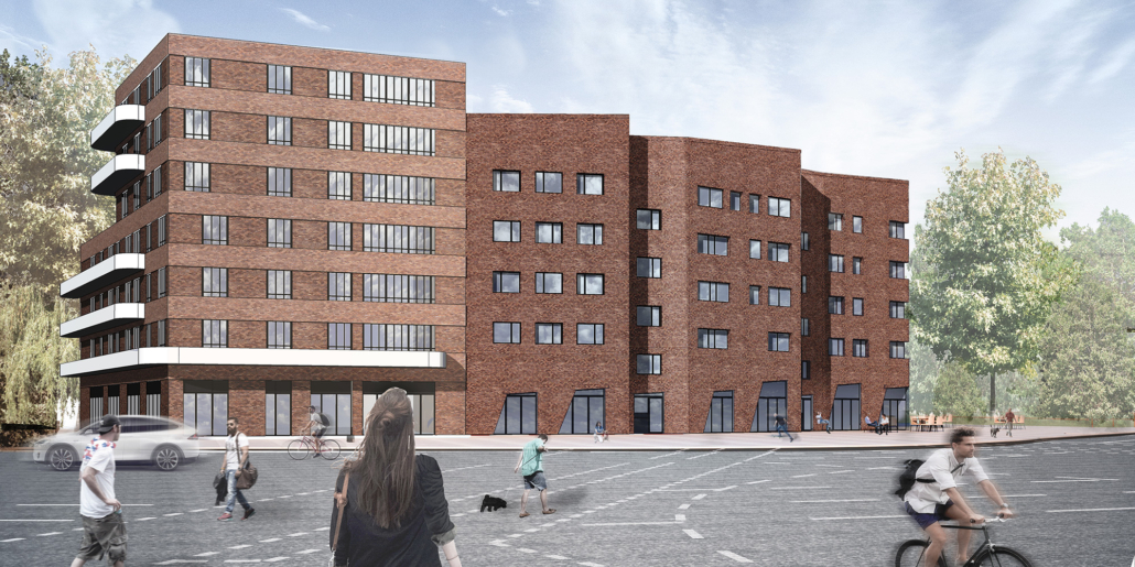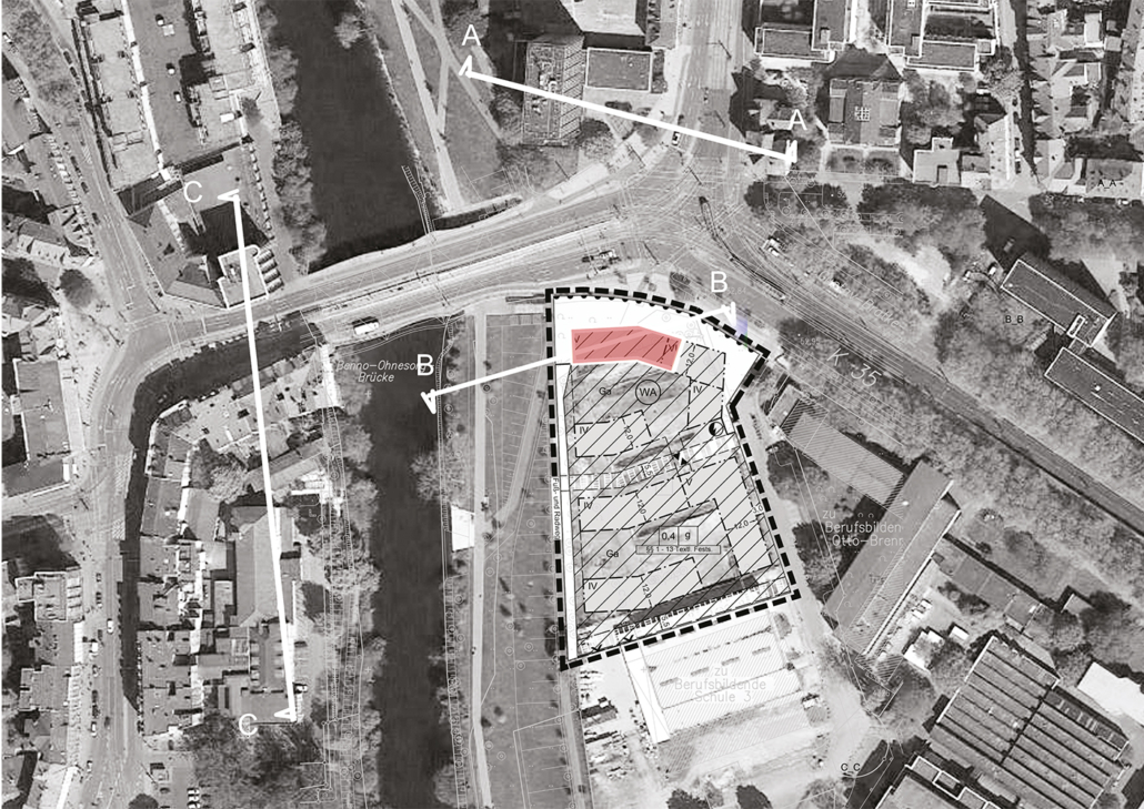 Der prominente Bereich Gustav-Bratke-Allee mit dem Blick von der Benno-Ohnesorg-Brücke und aus der Humboldtstraße ruft regelrecht nach einer besonderen Betonung der neuen Fassade. Entsprechend den herausragenden Bauwerken in der näheren Umgebung, wie dem Capitol schlagen wir an dieser Stelle ebenfalls eine eigenständige, zeichenhafte Fassadengestaltung vor. Dies wird durch eine schuppenartige Auffaltung der Schauseite über die eigentliche Baugrenze hinaus und dem Herumführen der Fassade entlang des Ihme-Ufers erreicht. Die expressive Betonung der Ecke und der überhöhte Dachabschluss interpretiert die Höhenentwicklung der Bestandsbauten der Umgebung in einer klassischen zeitgemäßen Form neu.