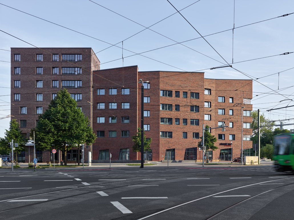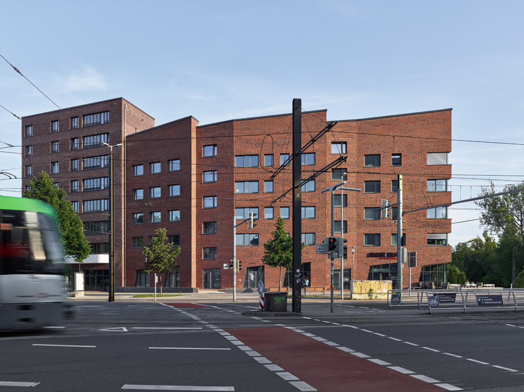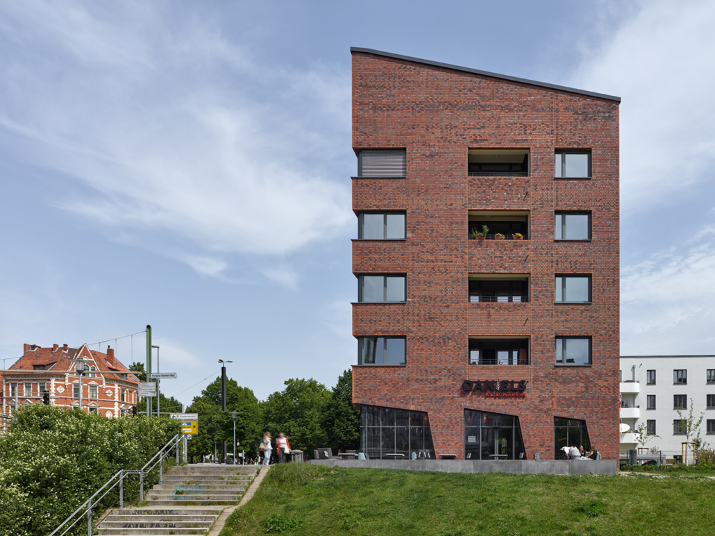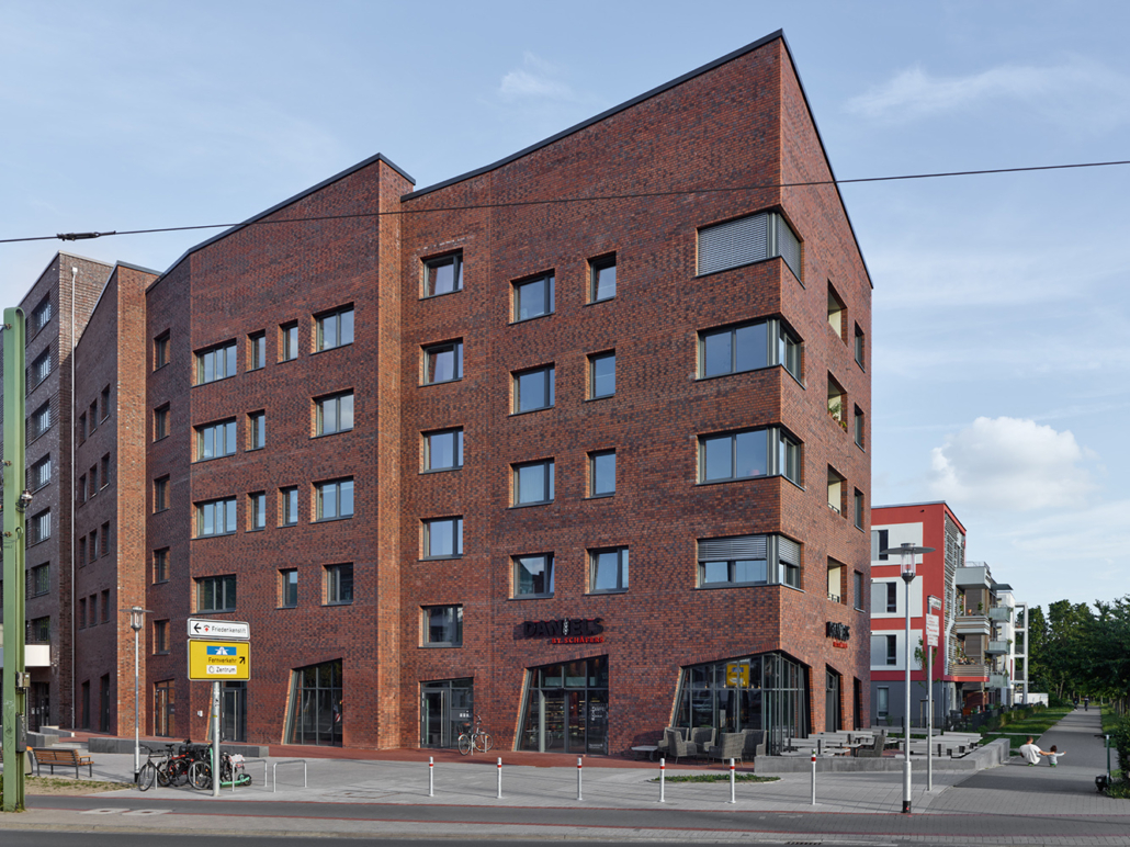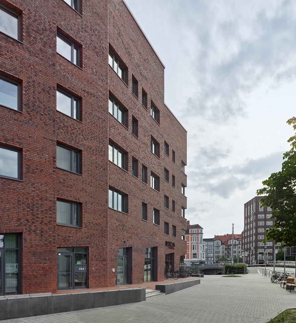 Bodentiefe Öffnungen im Erdgeschoss mit einer nach innen gerückten Fensterebene nehmen das Motiv des Dachabschlusses auf und bilden die Zugänge zur Gastronomie, den Treppenaufgängen und dem Durchgang in den Hof. Durch diesen Rücksprung kann auf Vordächer verzichtet werden. Die Fensteröffnungen in den Obergeschossen bemessen sich in ihrer Fläche nach den Vorgaben des geforderten Passivhausstandards. Durch die vor- und zurückspringende Fensterebene (Erdgeschoss, Loggia, Obergeschosse) entwickelt sich ein lebendiges Fassadenspiel. Die Übereckverglasung betont zudem die Gebäudespitze zur Ihme und der Benno-Ohnesorg-Brücke.