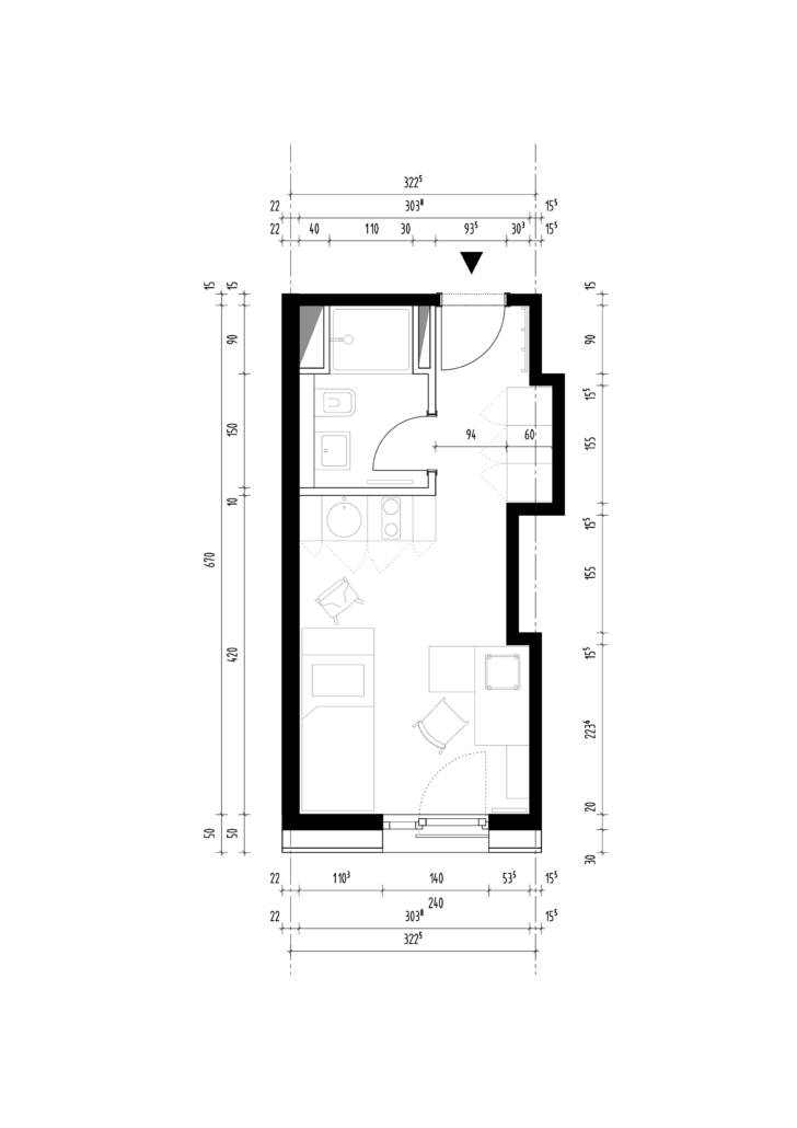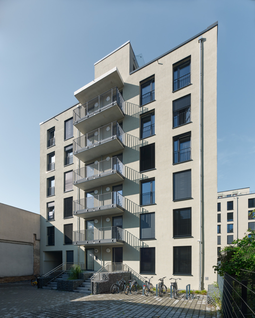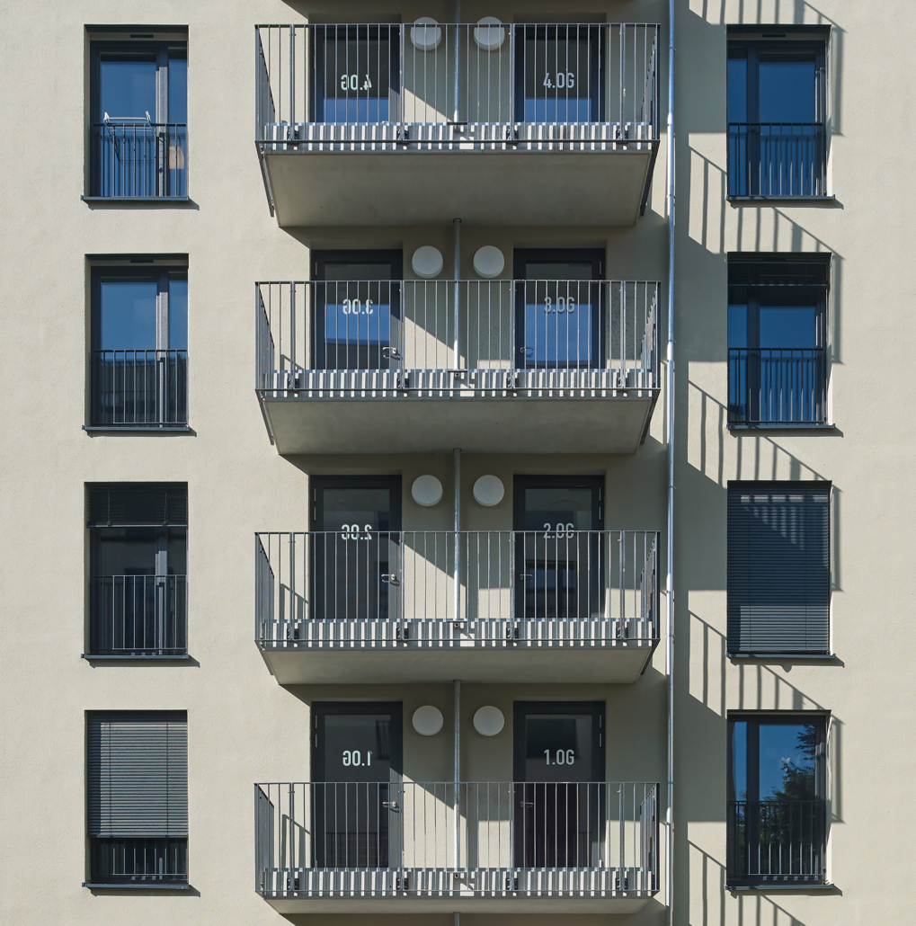 Die Apartments werden über einen Mittelflur erschlossen und sind bei einer Gebäudetiefe von 15,80 m jeweils nach Osten bzw. Westen orientiert. Im Staffelgeschoss sind die Apartments eingerückt und die Erschließung erfolgt über den überdachten Außenbereich. Die Gebäude sind flächeneffizient geplant – Bauteil 02 und 03 verfügen über je ein Treppenhaus, das als Sicherheitstreppenhaus ausgeführt wird. Die Apartments sind mit 19 qm Wohnfläche inklusive Küche und Bad ein Minimalwohnraum, der mit den bodentiefen Fenstern einen großzügigen Bezug in den Außenraum erhält.