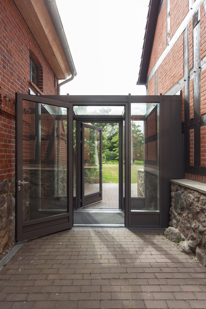 Ein gläserner, eingeschossiger Verbindungsbau stellt einen beheizten Übergang von der Wohnhalle des Haupthauses zur Scheune her.