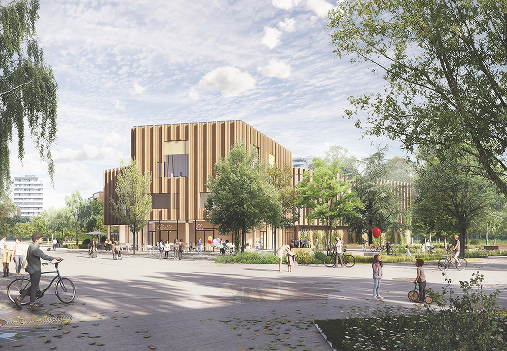 Das Gebäude verfügt über eine freie Formgebung und angenehme Proportionen, die sich in alle Richtungen öffnen, sodass alle Menschen willkommen sind. Die zentrale Funktion des Entwurfs spiegelt sich im Foyer wider, das  offen für eine lebendige Nachbarschaft ist. Alle Eingänge führen direkt in dieses zentrale Foyer, von dem aus sämtliche Gebäudefunktionen sternförmig erschlossen werden. Dies ermöglicht kurze Wege und unterstützt das Konzept einer lebendigen Mitte, während gleichzeitig Rückzugsmöglichkeiten in den angrenzenden Bereichen bestehen.