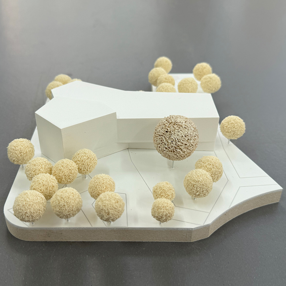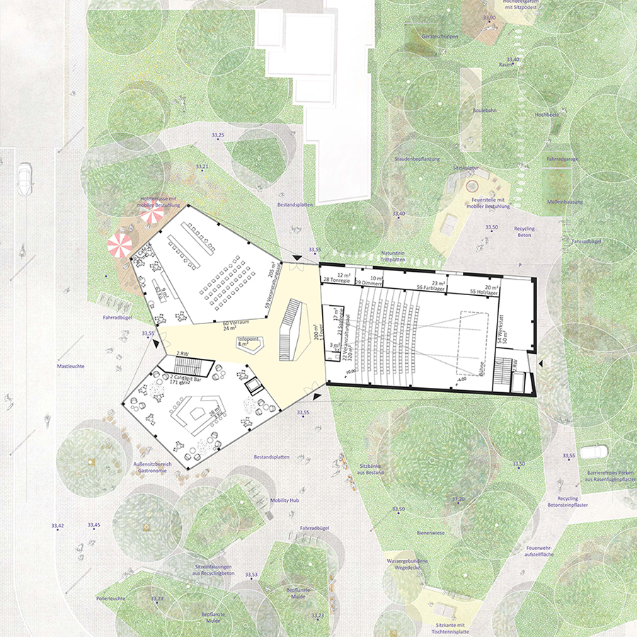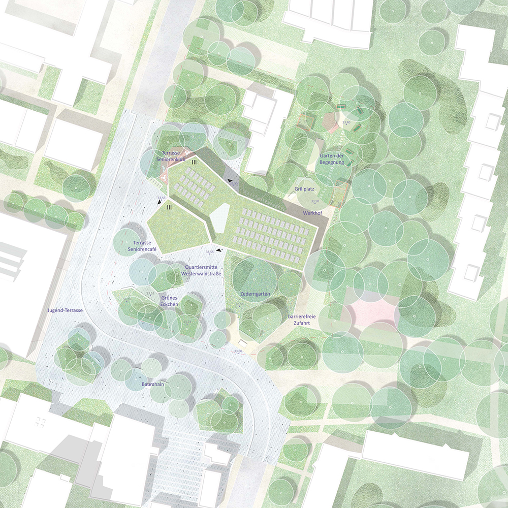 Das Gebäude interagiert durch die Ausrichtung seiner Funktionen und Zugänge gezielt mit dem umliegenden Ort und der Landschaft. Die bestehende Natur wird hierbei nicht nur geschont, sondern aktiv in das Konzept eingebunden. Alle Bestandsbäume bleiben erhalten und die Natur wird nahtlos bis auf dem Westerwaldplatz geführt. Die Gestaltung der Außenanlagen, die die versiegelte Fläche auf das absolute Minimum reduziert, schafft eine harmonische Gliederung des Platzes und verbindet das Gebäude mit seiner natürlichen Umgebung.