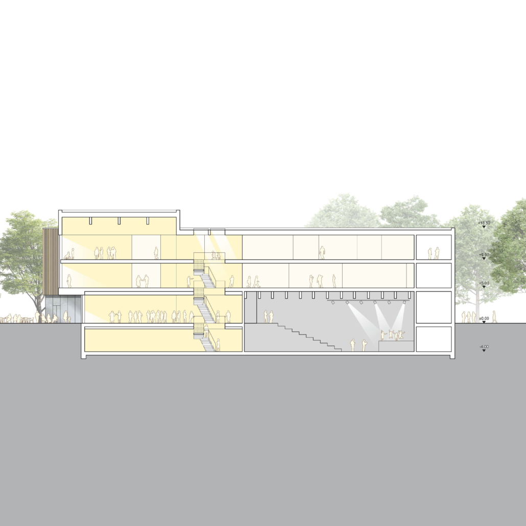 Das Erdgeschoss ist hell, offen und einladend gestaltet, mit einem Café, einem Jugendtheatersaal und einem großen Veranstaltungssaal, der ebenfalls ein Seniorencafé integriert. Diese Raumkonstellation belebt den Platz und schafft einen sanften Übergang zwischen Innen- und Außenraum. Die räumliche Gliederung des Baukörpers in drei Teile sorgt für eine angenehme Maßstäblichkeit. Die verschiedenen Funktionsbereiche sind klar zugeordnet: Das Jugendtheater im westlichen Gebäudeteil, die Kurs- und Gruppenräume im südwestlichen und nordwestlichen Teil, und die Mehrzweckräume sowie Büroflächen in den oberen Geschossen.