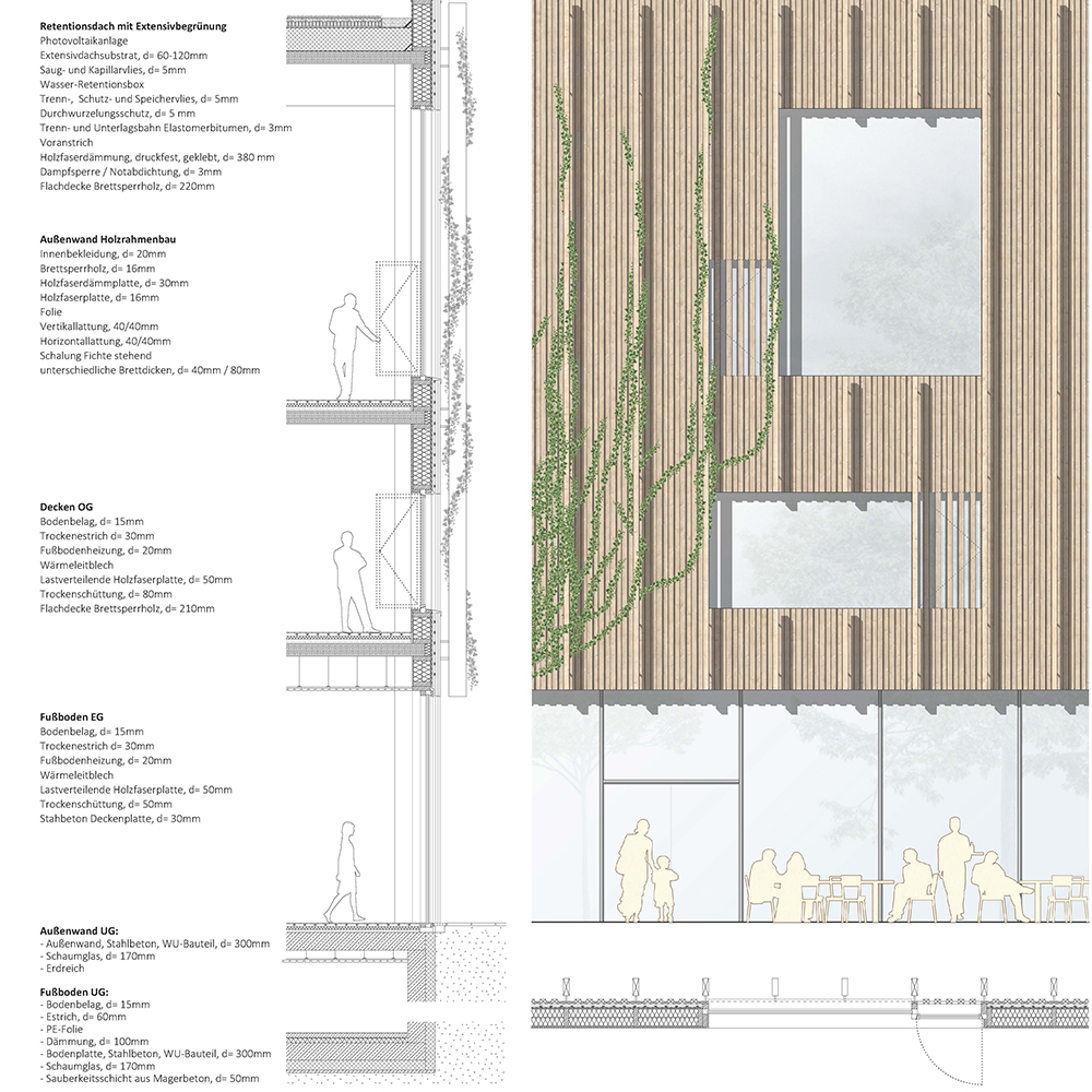 Das Gebäude wird als Holzbau mit Holzskelett realisiert, was eine nachhaltige und ökologische Bauweise darstellt. Lediglich die erdberührenden Bauteile werden als weiße Wanne in wasserundurchlässigem Recycling Beton (R-Beton) ausgeführt. Diese Konstruktion gewährleistet nicht nur Stabilität, sondern unterstützt auch den ökologischen Ansatz des Projekts durch den Einsatz von recycelten Materialien gemäß der Cradle-to-Cradle-Prinzip.
