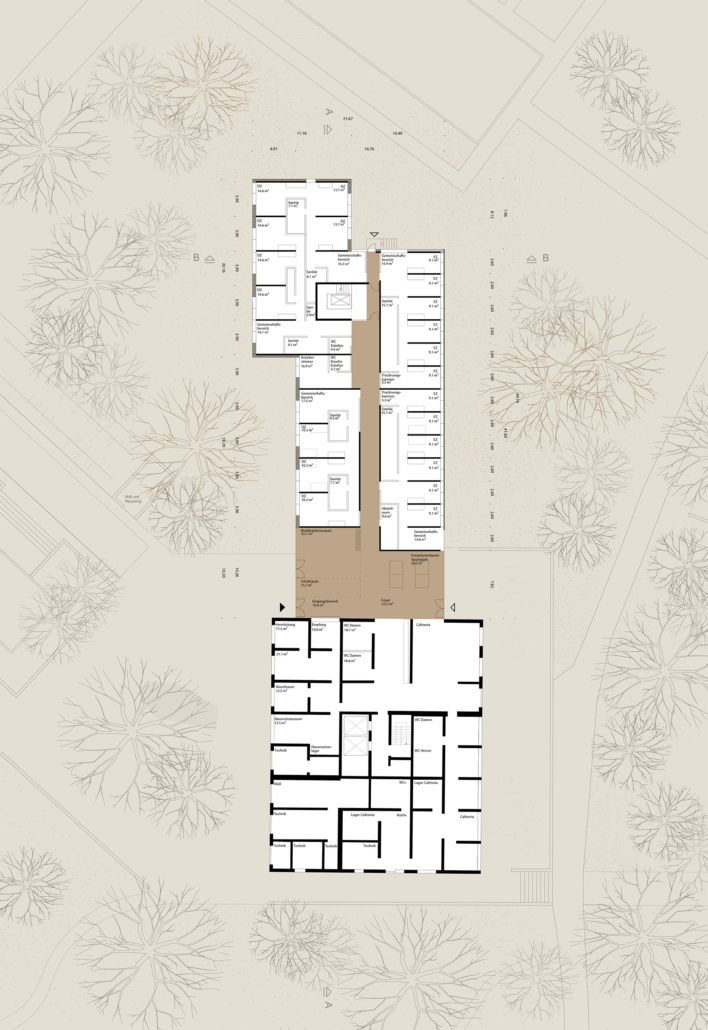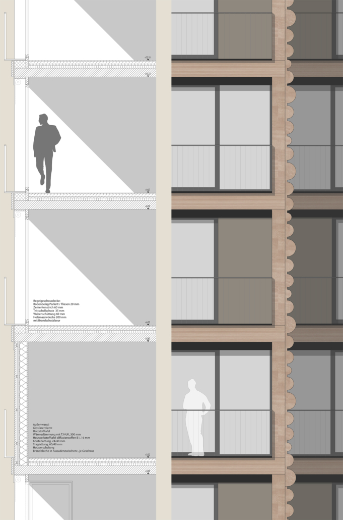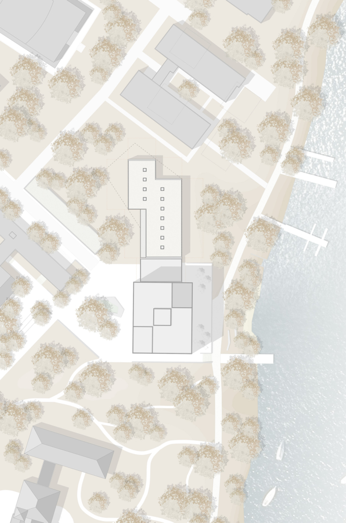 Der Entwurf fügt sich als flacher Baustein nachbarschaftlich in das Ensemble aus Solitären. Als fünfgeschossiges Bauwerk ergänzt er spannungsvoll das bestehende Wohnhochhaus. Beide sind im Erdgeschoss über ein transparentes Eingangsgebäude miteinander verbunden. Das Gebäude ist im Inneren klar über eine Mittelgangserschließung strukturiert, die Wohnräume orientieren sich zur Seeseite oder zum Wald. Das Wohngebäude ist als Holzbau mit Holzfassade geplant. Als Kontrast zu den transparenten Fassaden Richtung See und Wald sind die Nord- und Südwand geschlossene Holzfassaden aus rohen Halbstämmen.