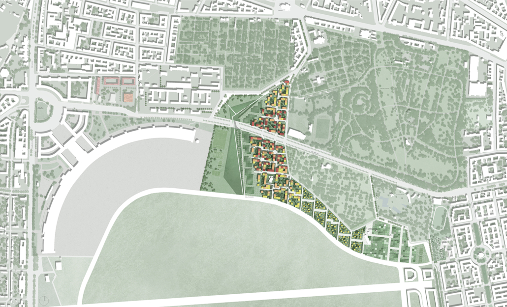 Im Rahmen einer prozessualen Entwicklung wird das Tempelhofer Feld zunächst geöffnet und mit temporären Nutzungen erobert. Der Zugang wird in Form einer modellierten Landschaftsbrücke markiert und schafft einen ersten Überblick über das Feld. Das „Spiel der Möglichkeiten“ stellt die Regeln auf, mit denen das Feld von den Benutzern weiter entwickelt werden kann. Am langfristigen Zeithorizont entsteht das Columbia-Quartier als integrativer Stadtbaustein, der die umgebende Viertel Neukölln und Kreuzberg mit dem Tempelhofer Feld verbindet.